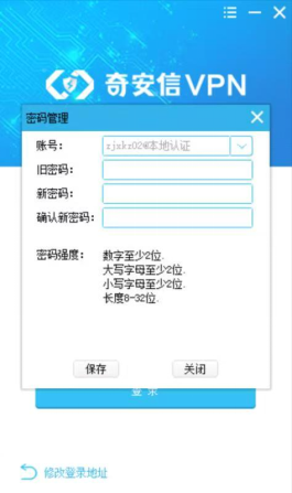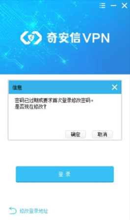 输入VPN账号及初始密码(在办结的VPN申请流程中会提供账号和初始密码),首次登录会提醒修改密码,修改密码后重新登录。